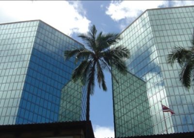 EnduroShield was applied to 30,000 ft² (2,800 m²) of glass at Pacific Guardian Center in Honolulu, restoring and protecting facades from heavy staining and reducing maintenance.